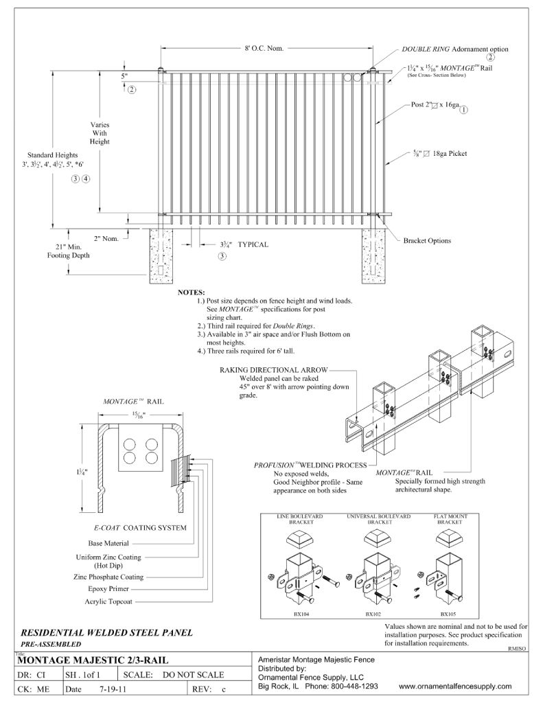 Montage Majestic Fence Panels and Gates have 15/16″ wide x 1-1/4″ high x 94″ long rails and 5/8″ square pickets.  The picket gap is 4″.